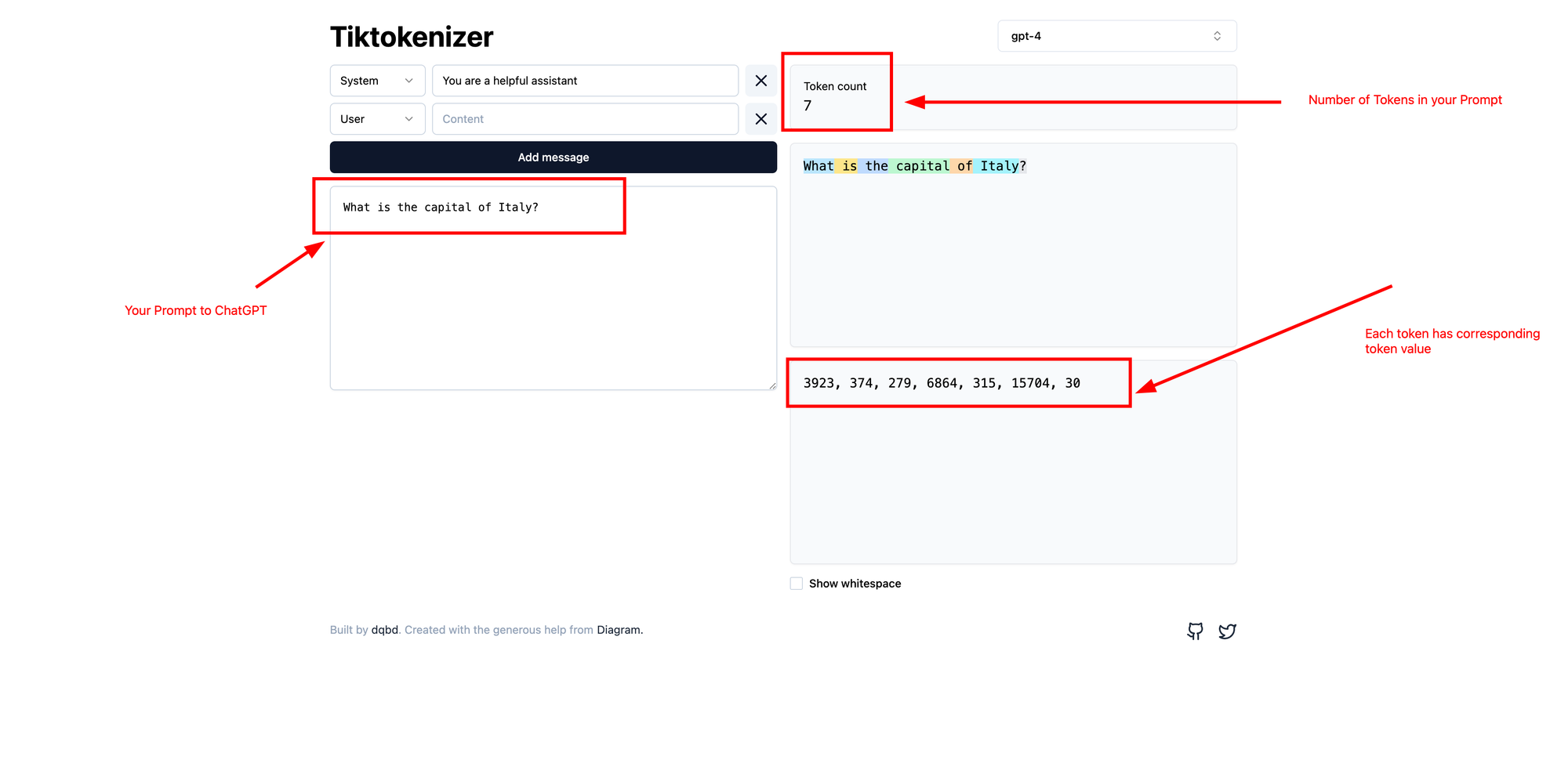 - "What", "is", "the", "capital", "of", "Italy", "?" ( use this platform to find number of token in your input --> https://tiktokenizer.vercel.app/?model=gpt-4